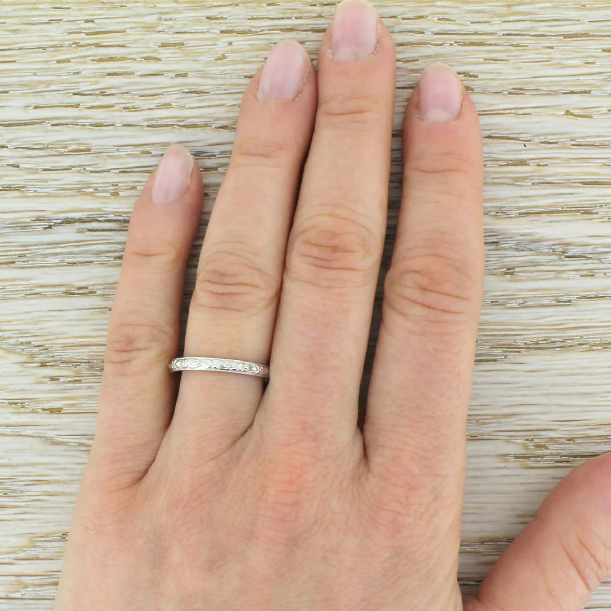 A pretty D-shaped band that aches with vintage charm. The beautiful detailing echoes designs from the late Victorian and Edwardian era.2mm wide.